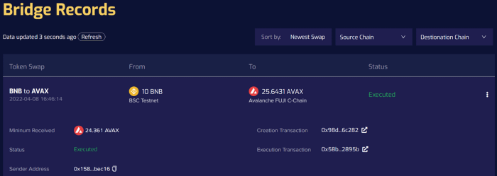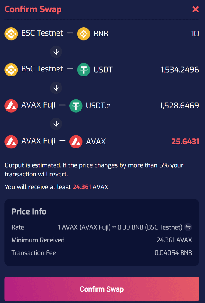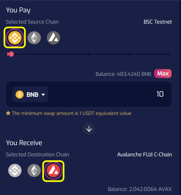 เลือกเชนที่แตกต่างกันระหว่างจ่าย และรับในหน้า Swap (เช่น BSC Testnet ไป Avax Fuji).