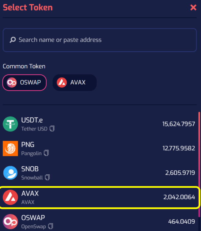 3. เลือกโทเคนที่ต้องการรับในเชนที่เลือกไว้ก่อนหน้านี้ (เช่น AVAX)