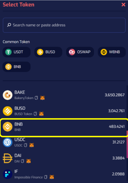 2. เลือกโทเค็นที่ต้องการจ่ายไป (เช่น BNB).