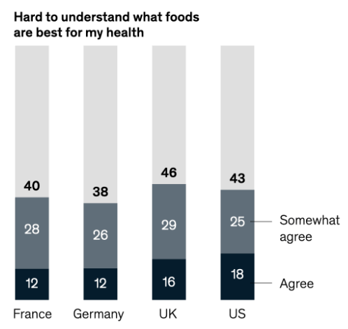 Málokdo totiž umí nebo má čas číst detailní složení potravin na zadní straně obalu. Jak ukazuje třeba nedávný průzkum McKinsey v největších zemích, zhruba 4 lidé z 10 přiznávají, že je pro ně těžké poznat, které potraviny jsou nejlepší pro jejich zdraví.