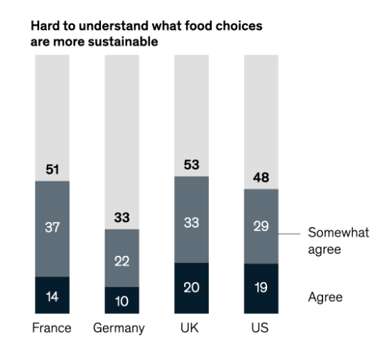 U udržitelnosti potravin se zdá, že lidé mají ještě horší přehled - s výjimkou Německa jich půlka říká, že je pro ně obtížné rozumět, které potraviny jsou víc udržitelné.