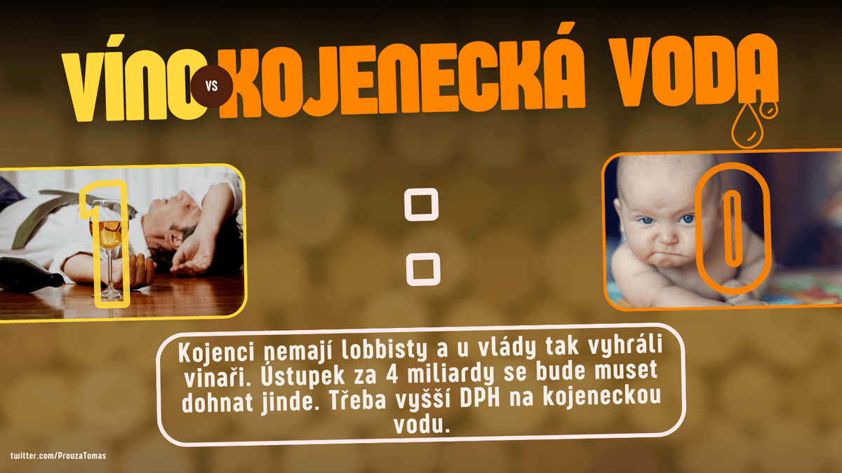 Má být levnější se opít než udělat dítěti sunar? Podle mě ne, podle vlády ano. Vinaři si vylobbovali, že se jich šetření týkat nebude a vláda bude muset hledat jinde. A tak zdražuje kojeneckou vodu přesunem do nejvyšší sazby DPH, zatímco víno bude mít dál nulovou spotřební daň.
