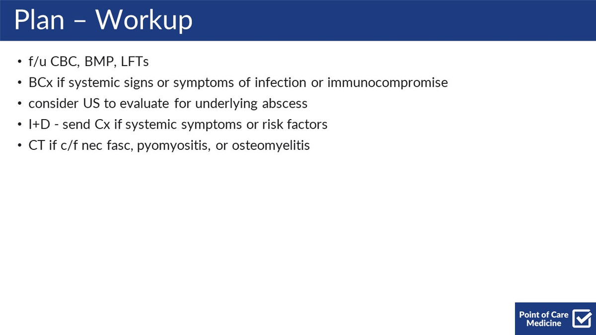- can't miss necrotizing fasciitis, DVT, septic joint