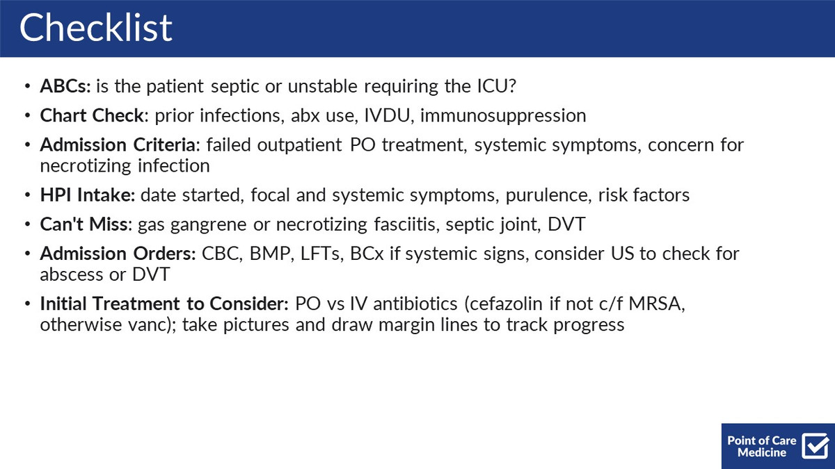Here's a checklist of other things to think about when admitting a patient with cellulitis.