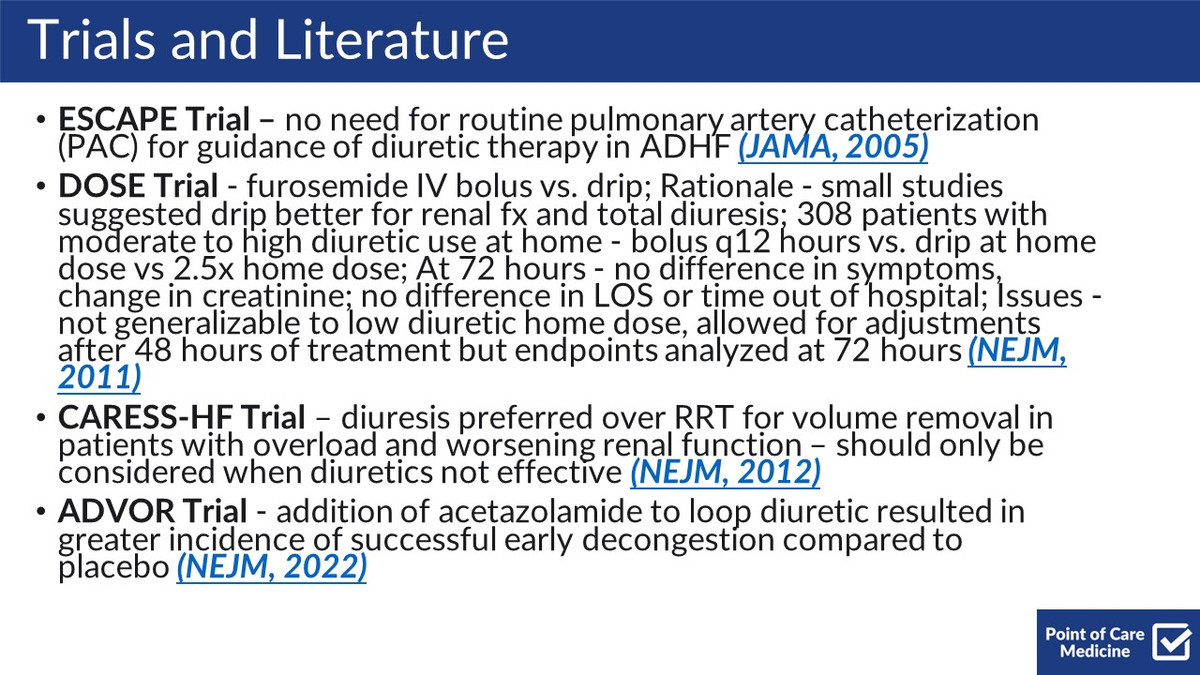 Here are some other key trials that inform our diuresis strategies. ESCAPE - no need for swans to guide diuresis in typical ADHF without shock DOSE - bolusing diuretics just as good as drip CARESS-HF - diuresis preferred first over ultrafiltration for volume removal