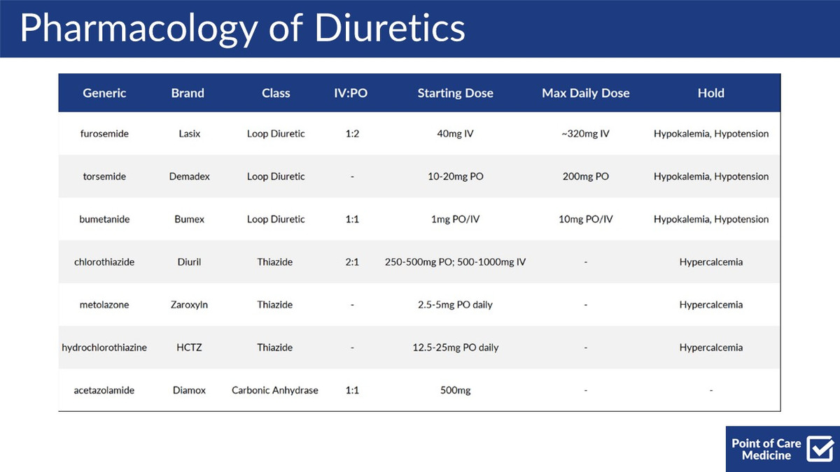 Troubleshooting Resistance - if 80-160mg IV lasix BID, consider: - Switching to drip (start 10mg/hr AFTER bolusing to keep above threshold) - Switching loops (40 PO lasix = 10-20 PO torsemide = 1 PO bumetanide) - Augmenting with thiazide (metolazone or chlorthalidone)