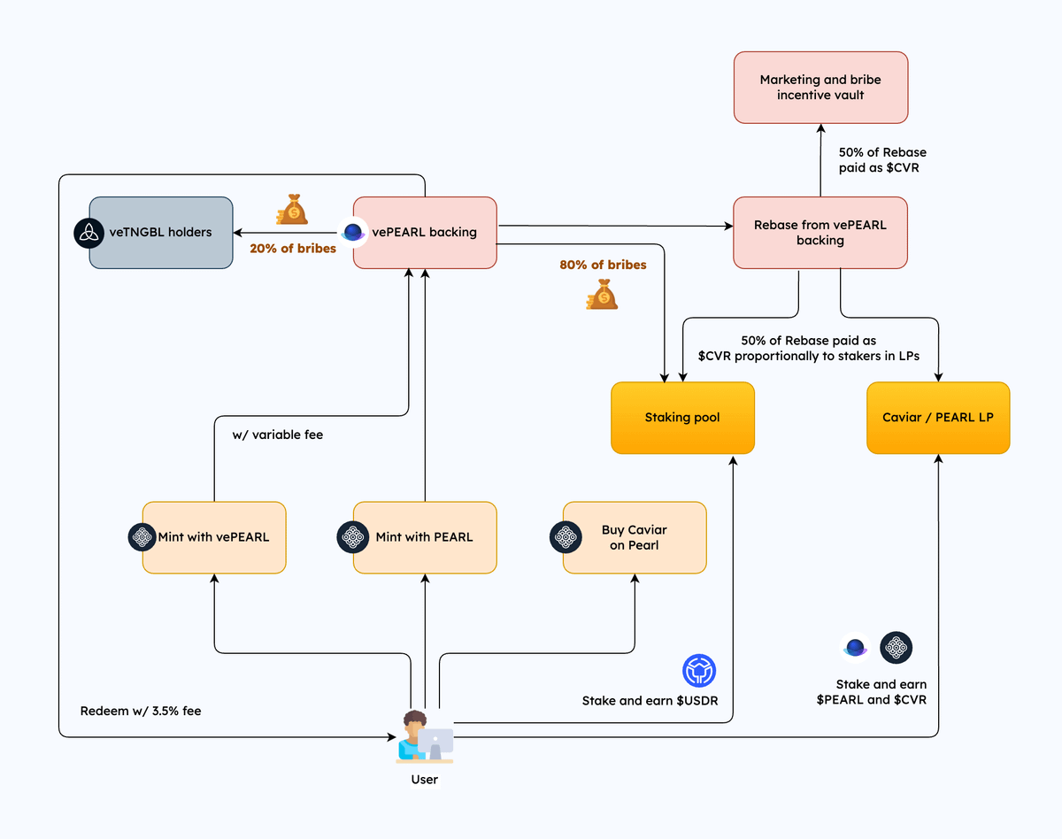 Tangible simply uses vePEARL that has been received from $CVR minting operations to vote on most profitable pools. Profit is shared as ;