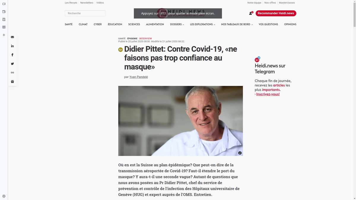 Une interview du Professeur Didier Pittet, qui exprime ses doutes sur les masques.