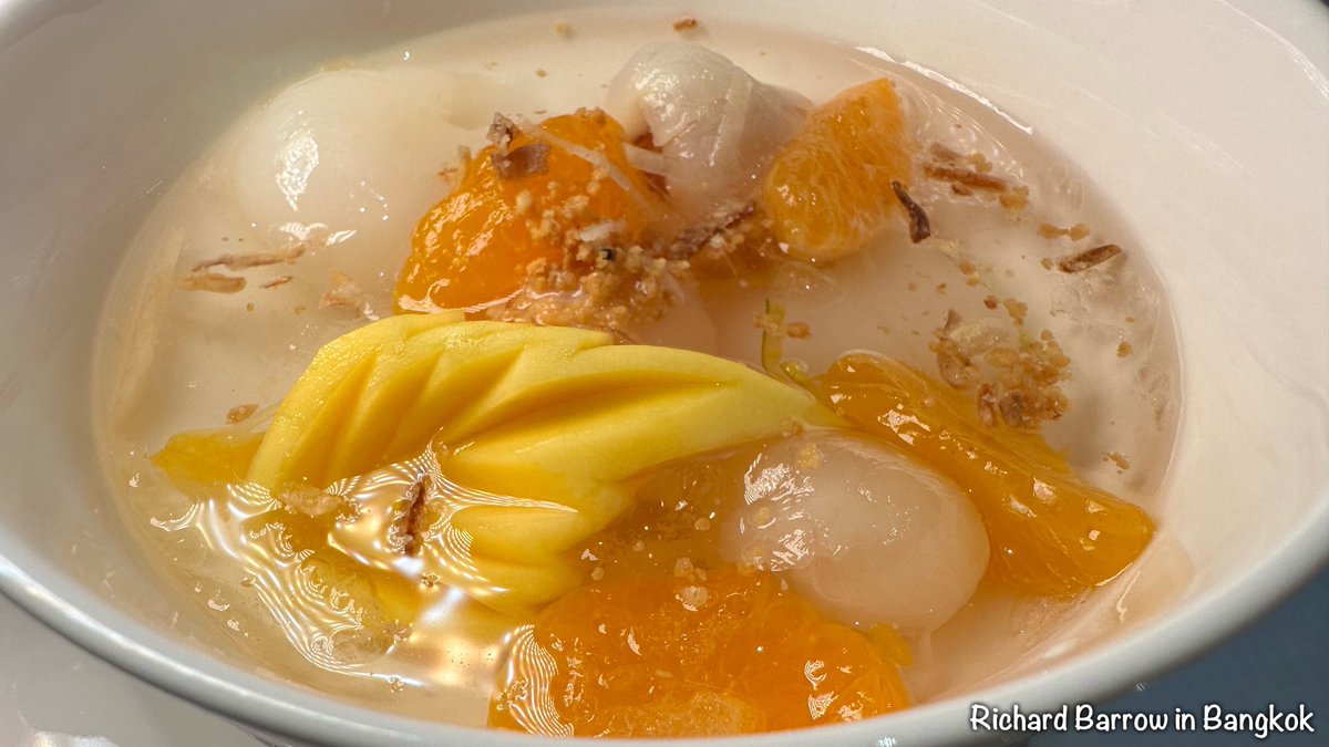 The evening meal finished with this fruit for dessert. I can tell you we needed that as the last dish was very spicy. My favourite was the second one, Moo Phat Raak Choo. But I also liked very much the first and third dishes.