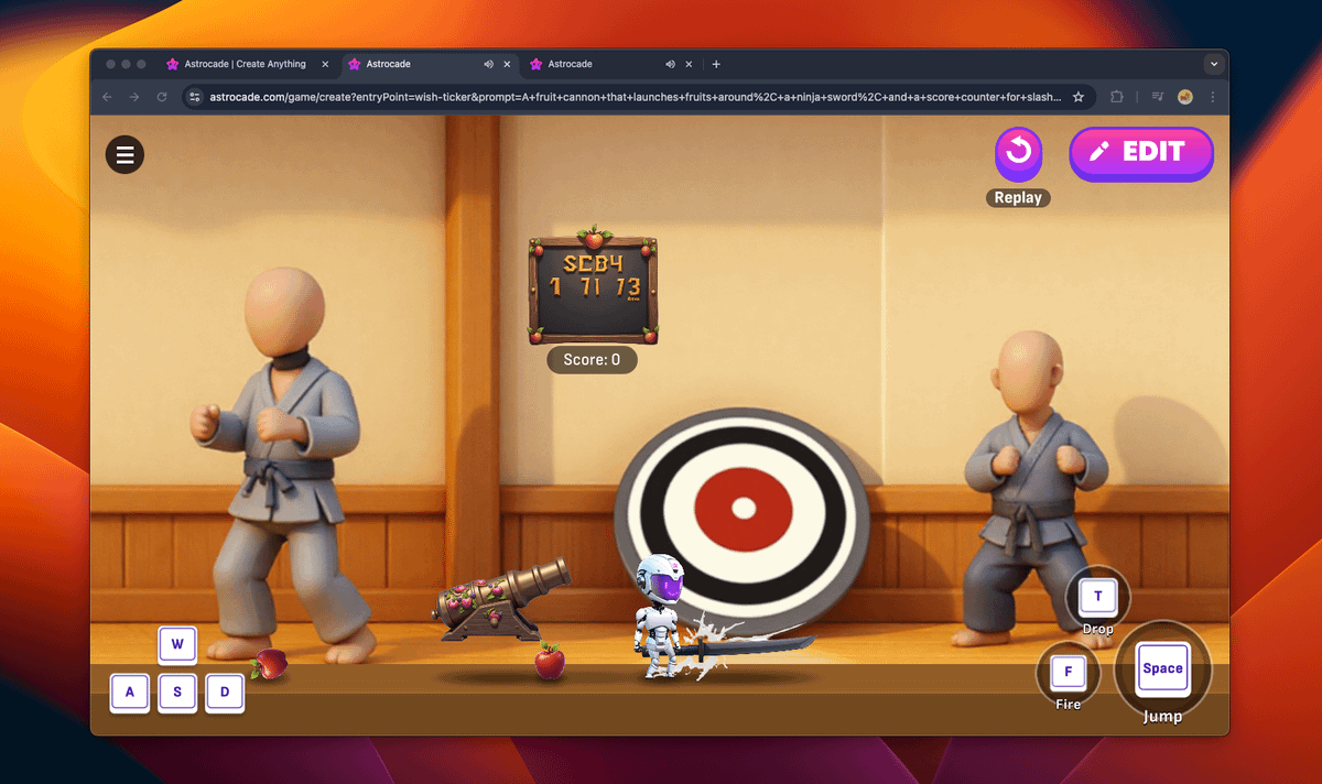 “Give me a fruit cannon that launches fruits into the air around a floating ninja sword.” 🍉⚔️