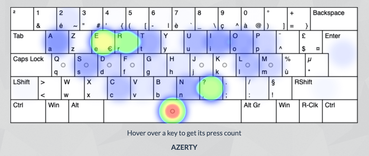 Grâce au site patorjk.com/keyboard-layout-analyzer/#/main il est possible de réaliser la même expérience avec le clavier azerty et le français. Voici le résultat.