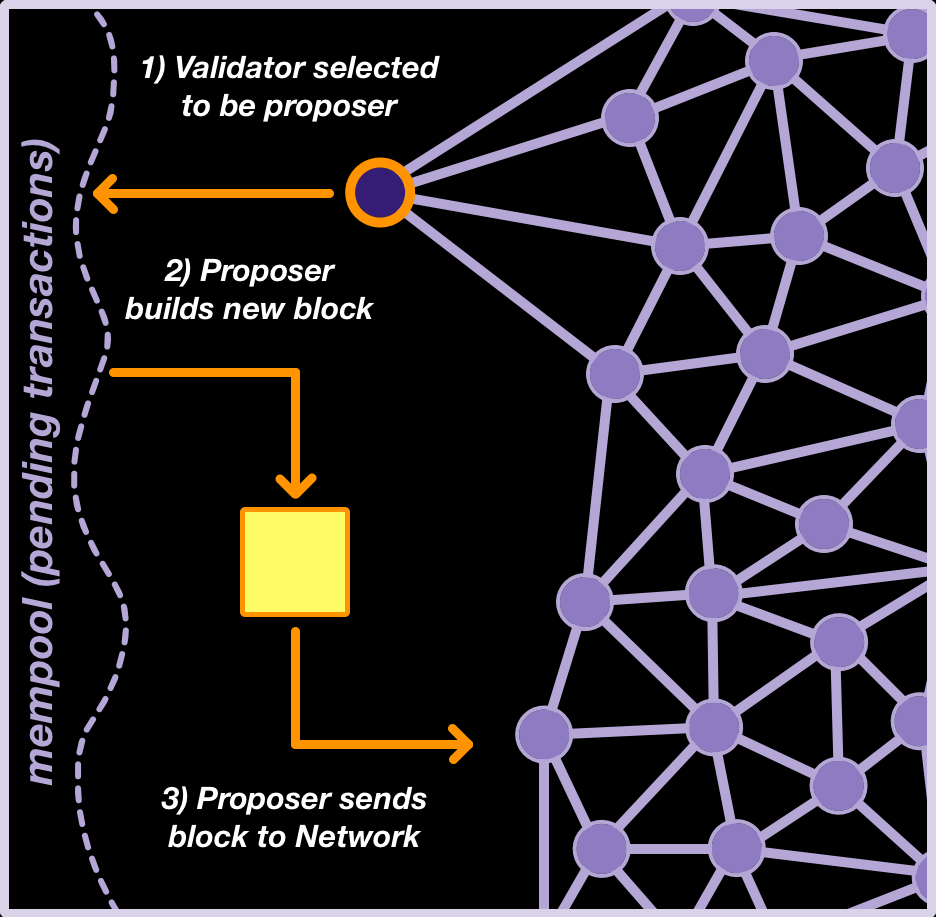 (3/24) PoS is a huge topic, here's what you need to know for this thread: - a block is a bundle of txns, which are executed in the EVM - users send pending txns to the mempool - once per slot, a validator is randomly selected to be a block proposer twitter.com/SalomonCrypto/status/1579594609855934465