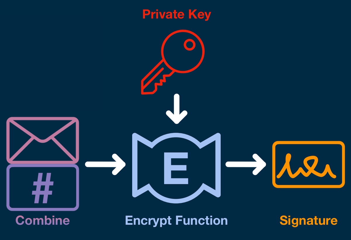 The combined message-hash and the signer's private key are fed into the encrypt function. The encrypt function will combine both components using advanced math to create the digital signature.