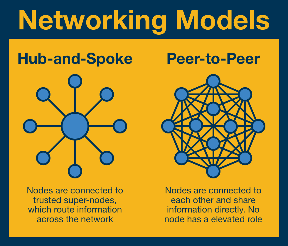 Hub-and-spoke = centralized (trusted) super-nodes route traffic through the network.