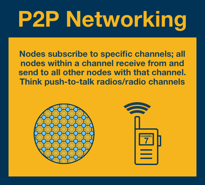 Peer-to-peer (P2P) = each node connects directly to its peer nodes. No node is more trusted than another.