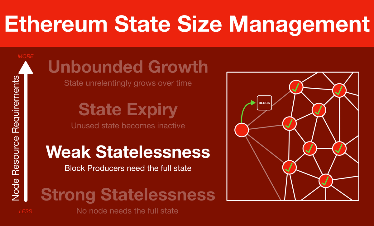 (15/22) Weak Statelessness allows all verifying nodes to be completely stateless. Nodes (or other entities) that build @ethereum blocks still need to hold the full state, specifically to generate the proof components.
