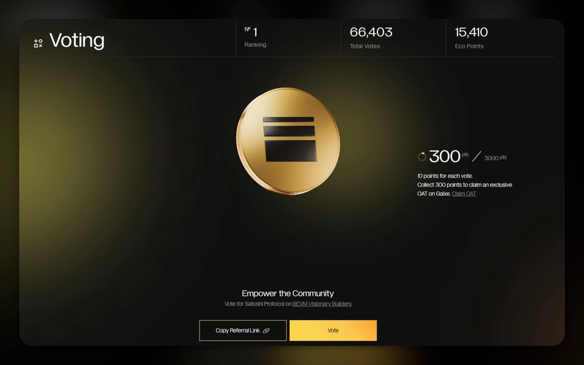 BVB Stage II : Vote for us & ALL the rewards are yours • 100% airdrop: Vote for Satoshi and become a BEVM whale • Bonus: Earn an OAT and up to 3,000 Points Cast your vote:
