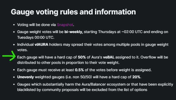 In the rules of $BAL gauges, 50% of AURA's $veBAL is the cap for any given LP. With the heavy bribes, we will assume that this LP ends with 50% of the $veBAL voting for $AURA emissions.