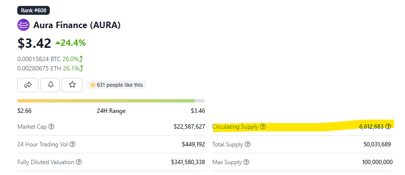 $AURA has a circ supply of around 6.6M tokens but that number actually includes 3.6M AURA that are locked for $vlAURA. That leaves 3M AURA unlocked...