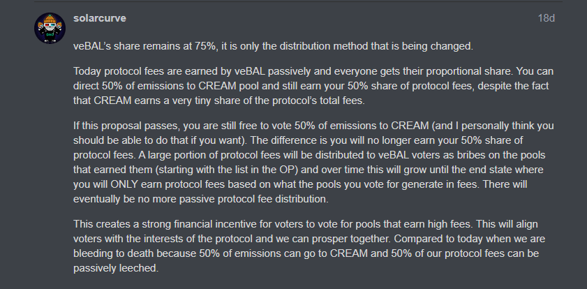 $CREAM, for example, votes for BAL rewards to their LP which has near-zero trading fees. Now that this passed, they will still be able to vote for rewards for CREAM LP but they miss out on the $veBAL protocol fees that are pushed to the core pools. No more *FREE* reward leeching