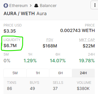 Due to this, you now have a project with exploding interest, extremely thin liquidity, and governance wars picking up. Liquidity has grown but it's in an 80/20 AURA/ETH LP meaning there is really only $1.3M ETH in the main LP