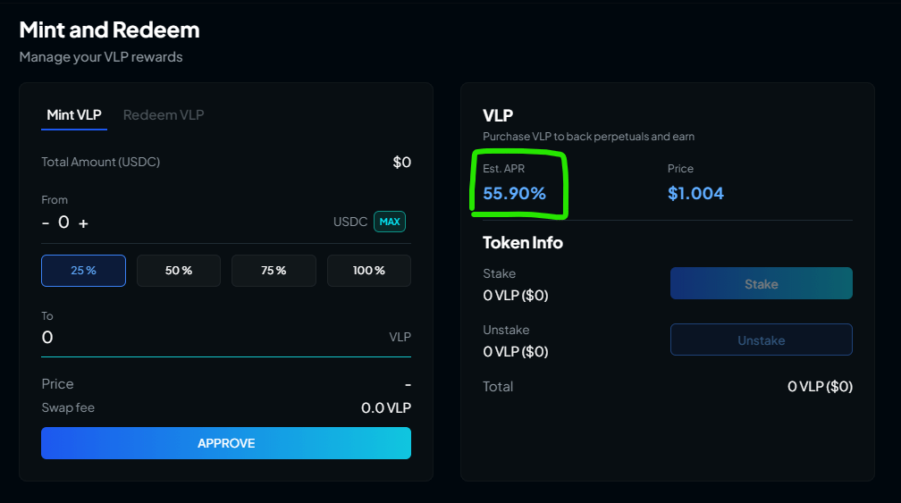 Imagine using $USDC to mint $VLP, earning 50% APR (assuming this APR holds), and then borrowing against your $VLP position.