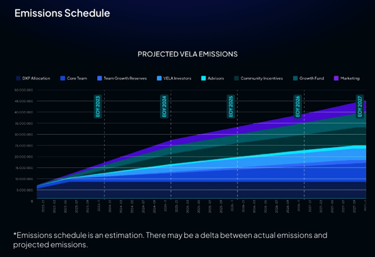 The updated emissions schedule, supply grows from ~7M to 17M in 2023, most of that supply will be paid out in $eVELA emissions.