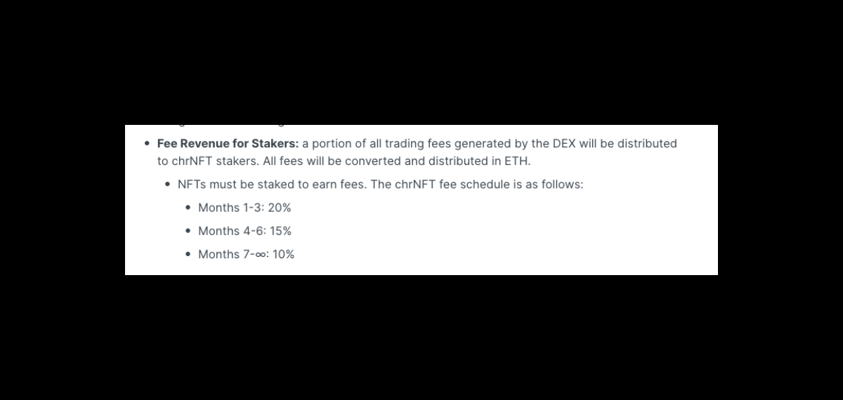 The $chrNFTs earn 15-20% of swap fees for 6 months and then 10% in perpetuity. Being ultra-conservative we will annualize using 10%.
