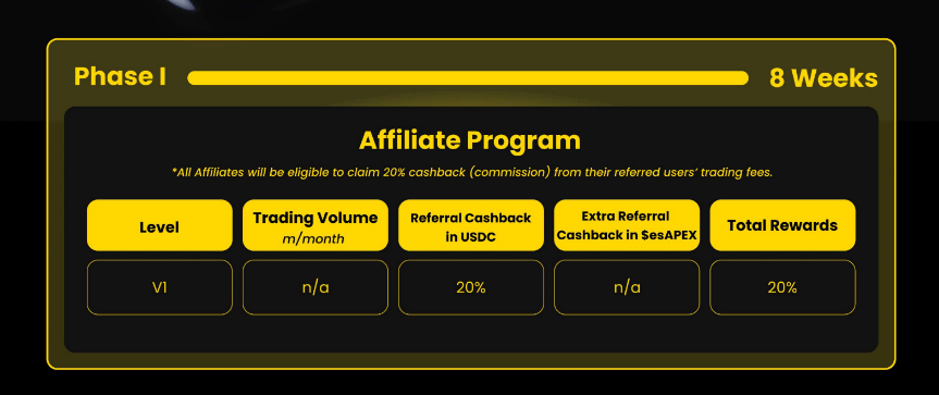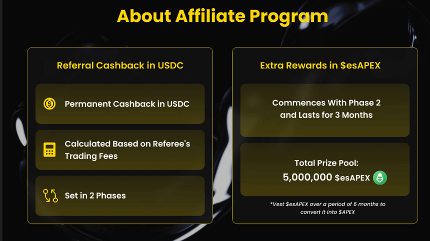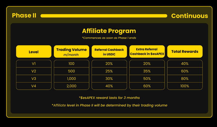 Mid-January Phase 2 kicks off where affiliates can earn 20-40% cashback in $USDC and up to 60% extra referral fees in $esAPEX. π