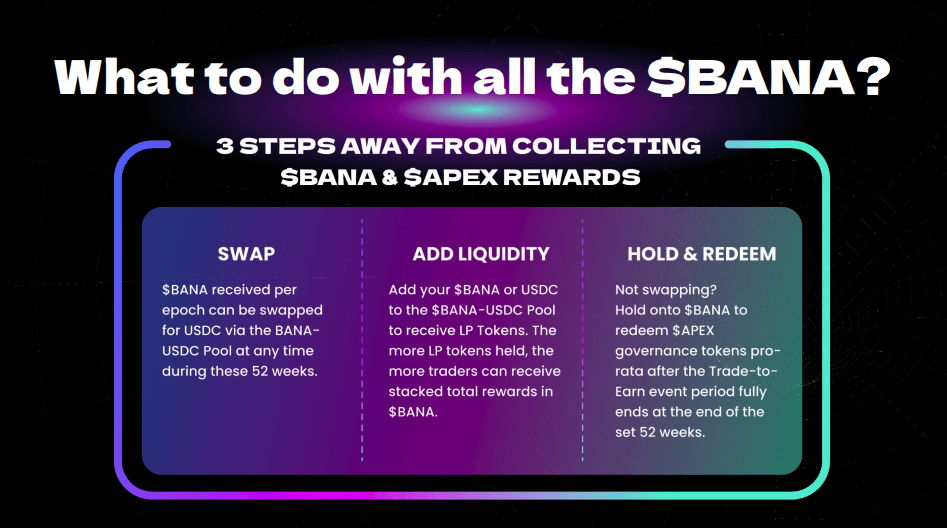 $BANA can be swapped for USDC, LPd (USDC/BANA), or held for a share of $APEX.