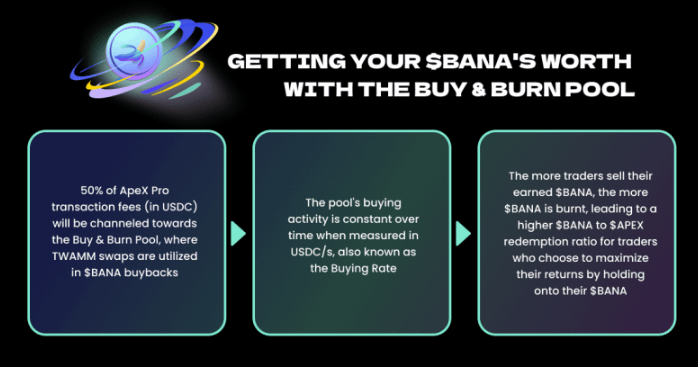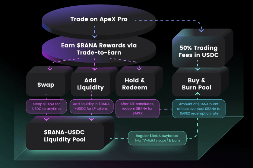 50% of Apex Pro fees will go toward using USDC to buyback + burn $BANA. This is volume for LPs and makes $BANA more scarce over time until the 52 week inventive program ends.