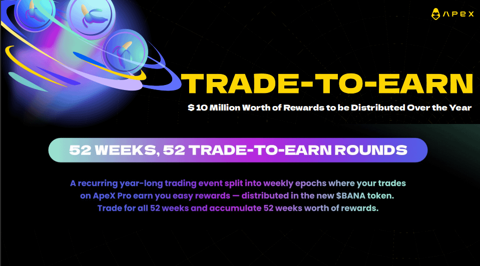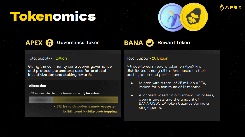$BANA - Trade-to-earn reward token minted with 25M Apex (2.5%). Allocated to traders based on fees paid, usage, and performance..