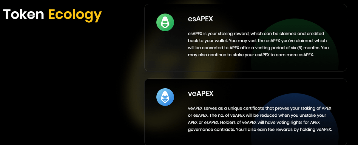 $esAPEX - Staking reward. Can be staked for more $esAPEX or vested over 6 months to become liquid.