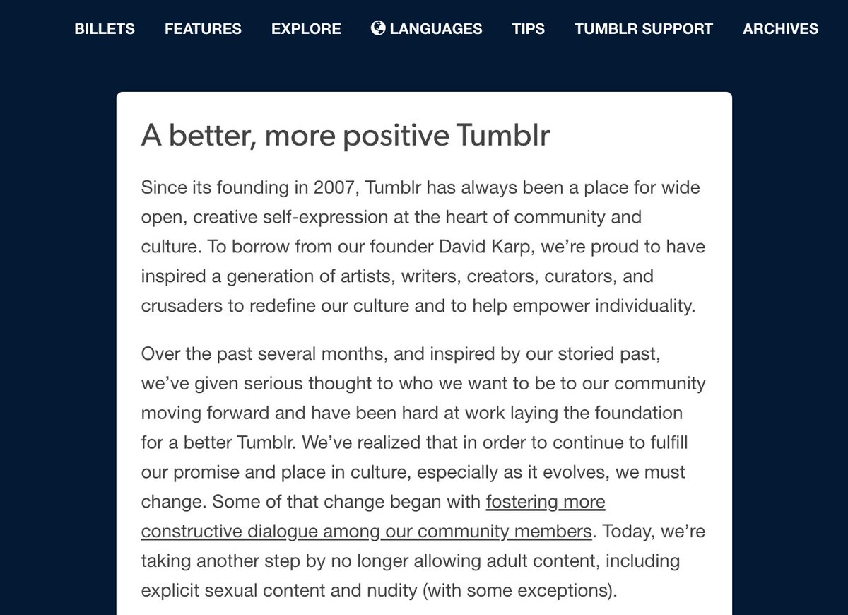 Il y a plusieurs raisons à ces changements : tout d’abord, Tumblr avait été retirée de l’Apple Store en novembre 2018 après un scandale impliquant de la pédopornographie. Après l’instauration des règles, l’application était redevenue accessible.