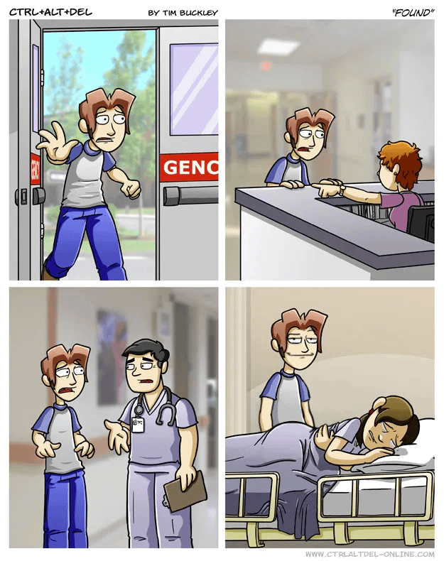 À l'origine, il y a ce comic, qui s'appelle lui-même Loss. Il décrit l'arrivée d'un jeune homme à l'hôpital où il trouve sa copine qui a fait une fausse couche ("loss" signifie "perte"). Rien de drôle comme vous pouvez le constater.