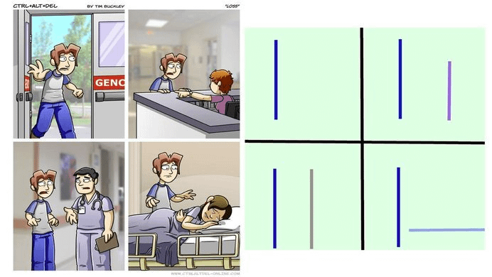 Puis certains remarquent que l'on peut simplifier la structure du comic à partir de bâtonnets, qui représentent le placement des personnages. C'est ce qui deviendra le véritable meme Loss.
