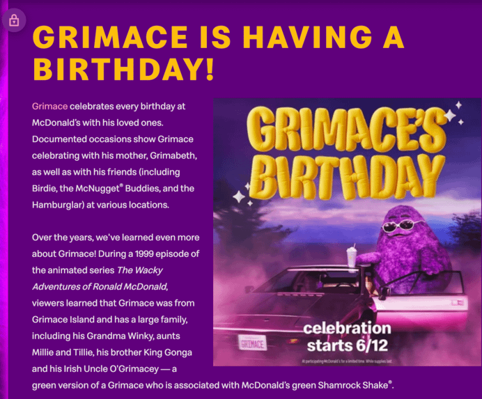 Aujourd'hui, la page wiki de Grimace est revenue à la normale, mais la page d'accueil du wiki McDonalds affiche cette même campagne de pub.