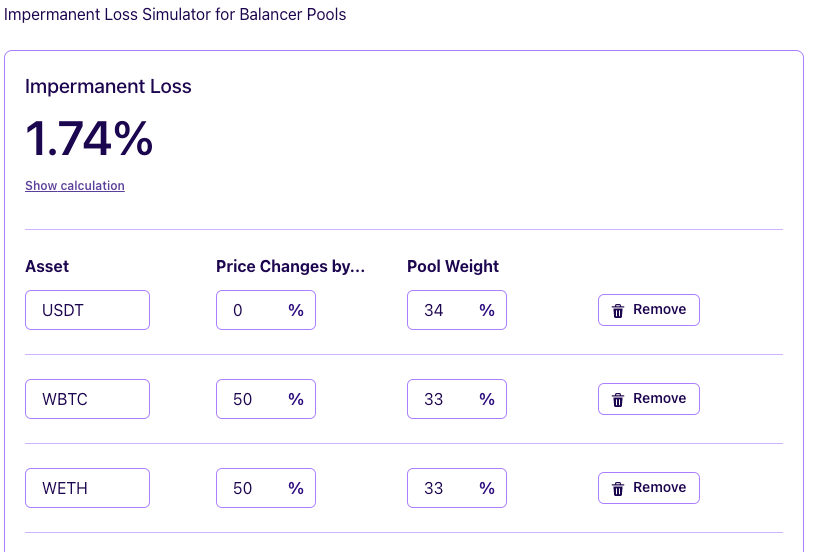 Suffers from impermanent loss. For instance, the pool will have 1.74% IL when there is 50% price change on both WBTC and WETH.