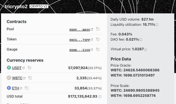 It is a Curve v2 liquidity pool consisting of equal portion of USDT/WBTC/WETH. It powers the swaps between these 3 assets on Curve.