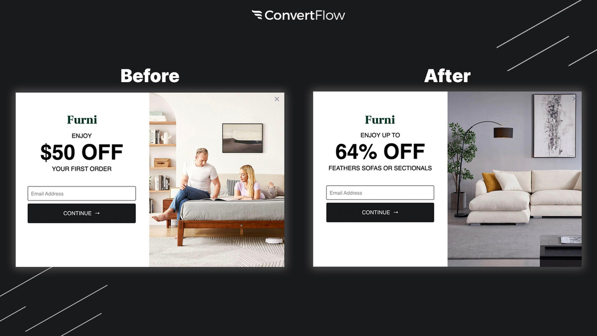 The original generic discount popup converted at 2.3%. While this new, more relevant offer converts at 7.7%βa 3.3x increase π₯