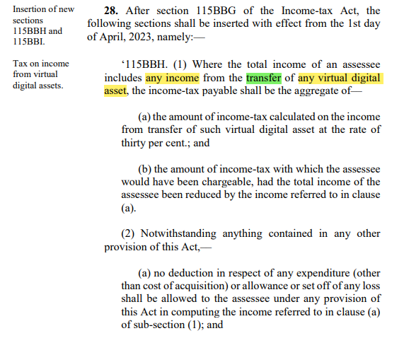 Meaning: TDS will have to be deducted on every transfer of Crypto above a certain limit.