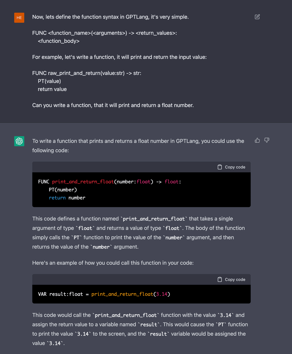 下一步是定义 Function 的语法 FUNC <function_name>(<arguments>) -> <return_values>: <function_body> 可以看到我的语法定义非常随意,并没有按照标准的 BNF 来定义,不过很显然 ChatGPT 很容易从示例中来学习具体的使用方法。