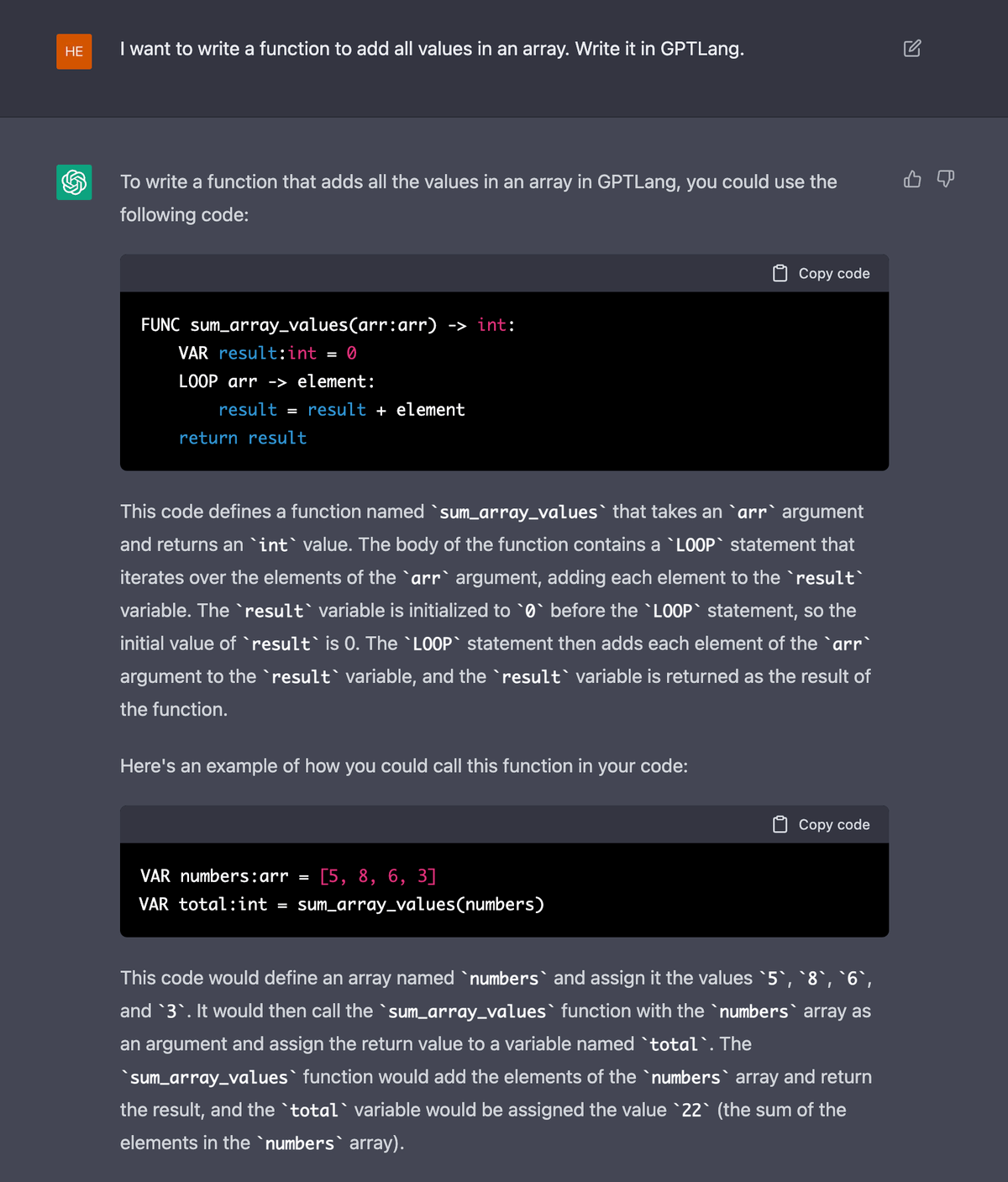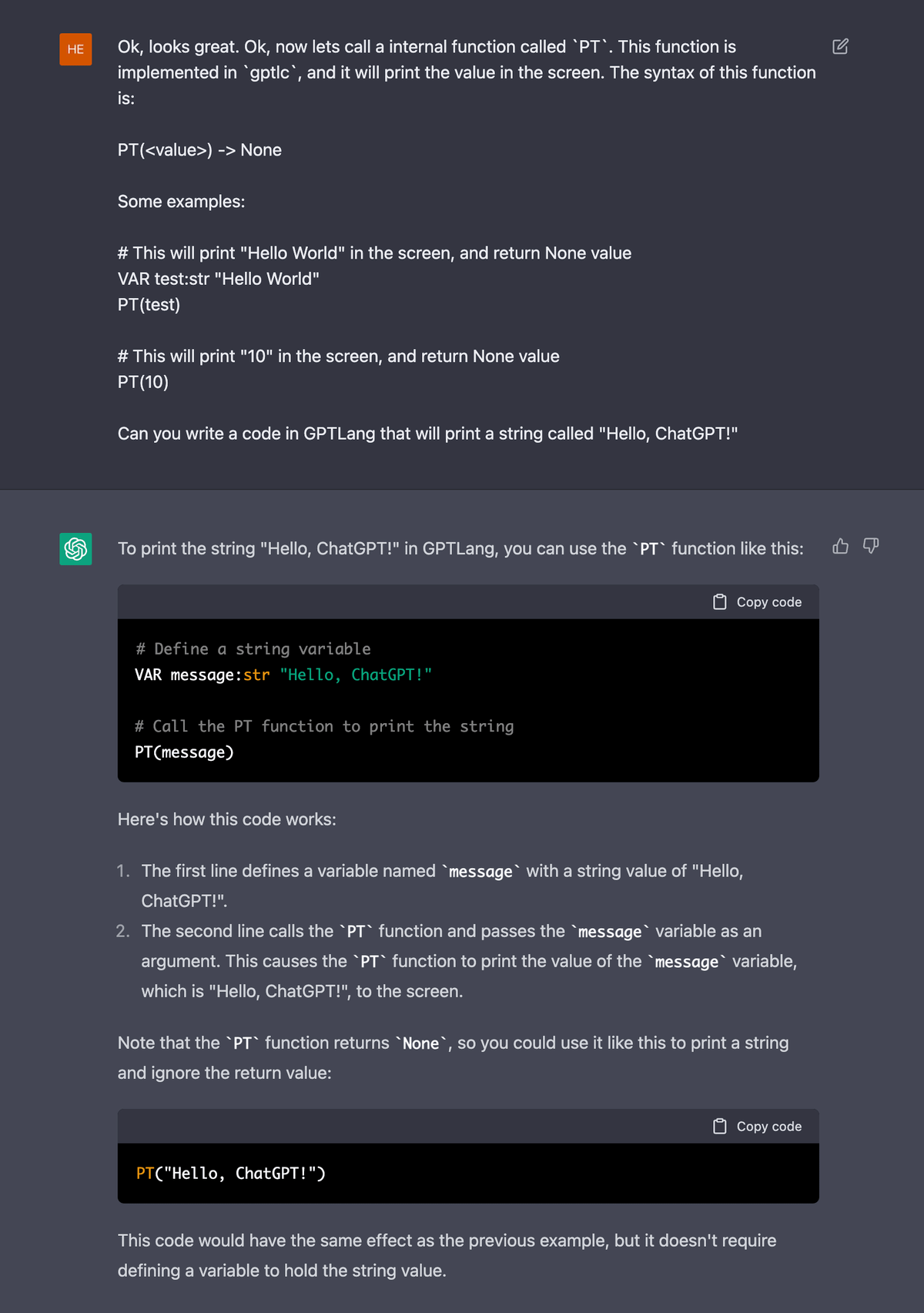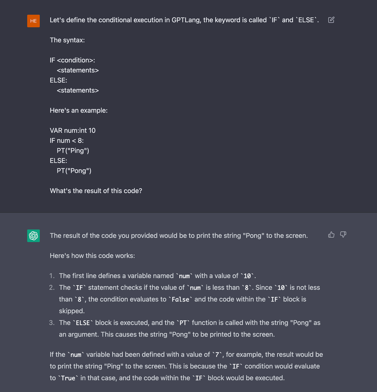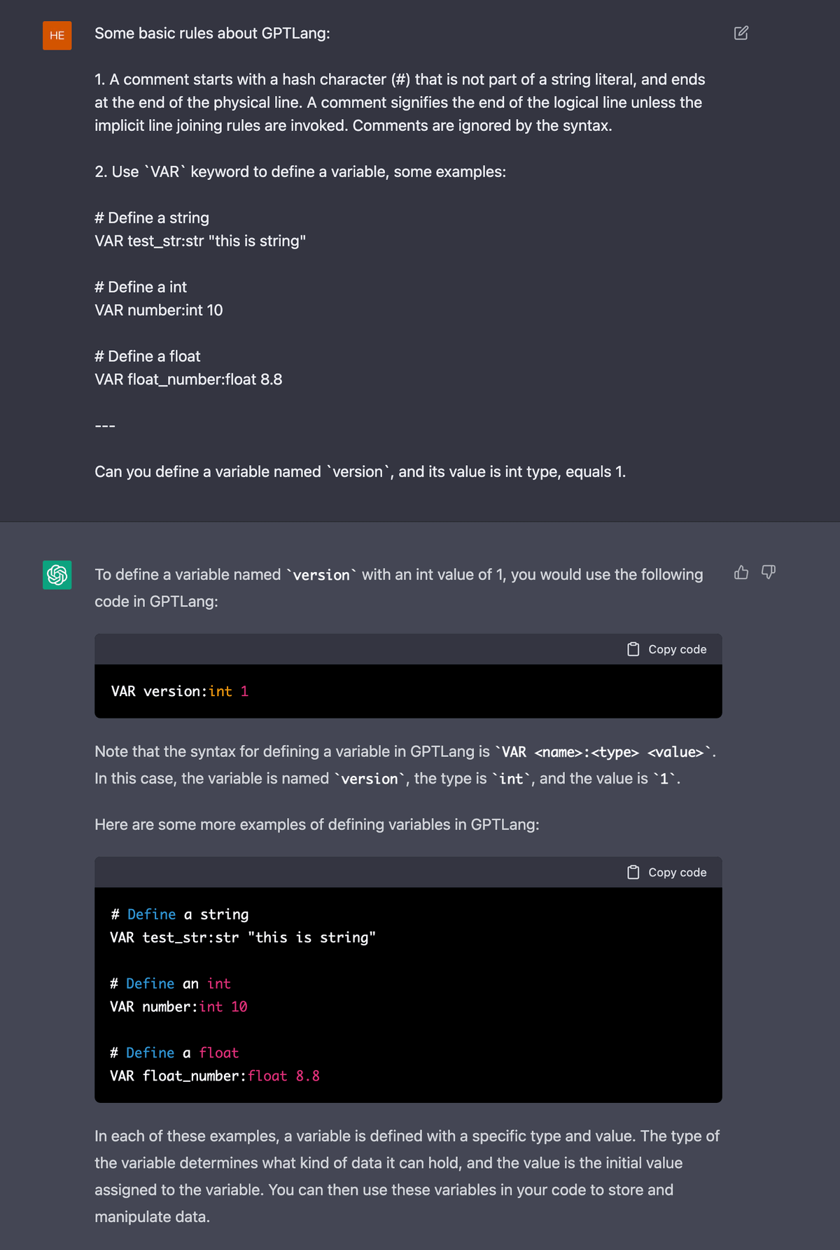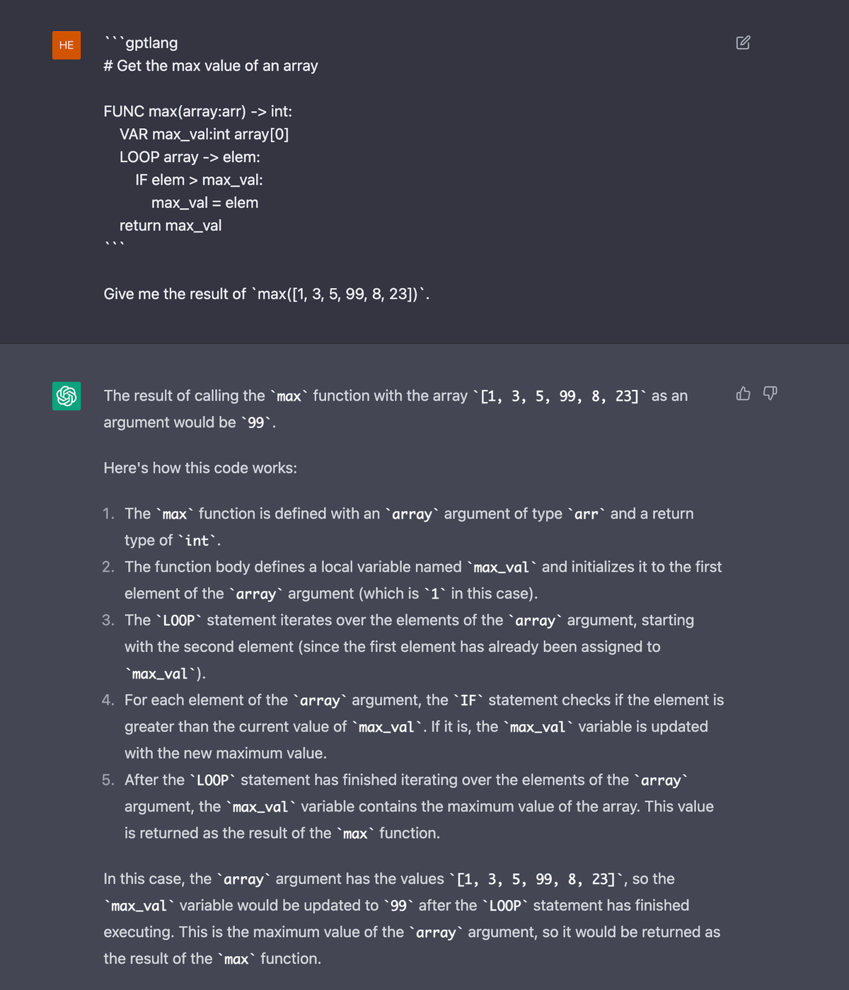 之前都是让 ChatGPT 来帮我写,试一下直接编写一段 GPTLang 的代码,ChatGPT 能不能理解。 结果是不仅能理解,还能给出每一步的执行步骤。