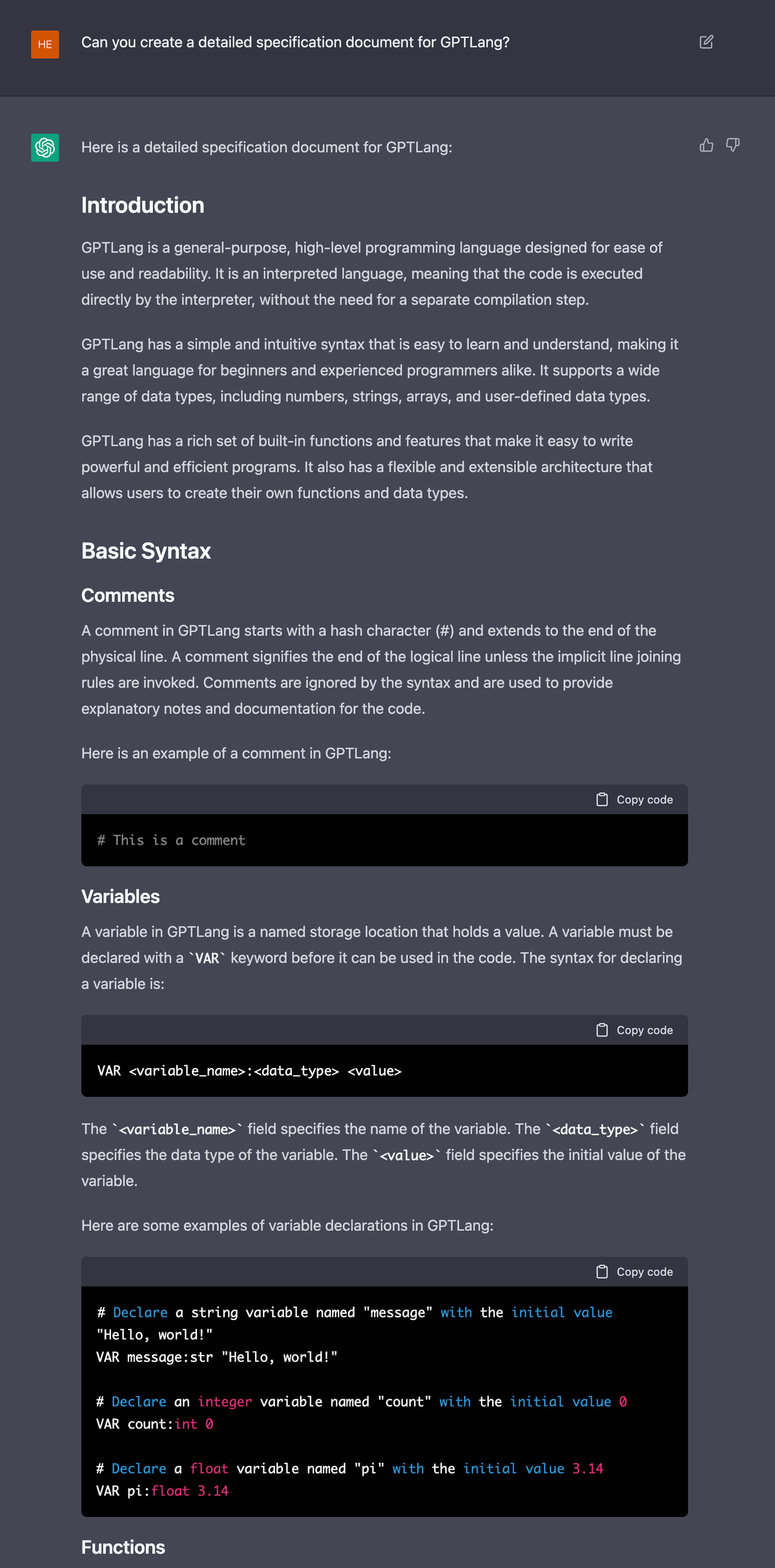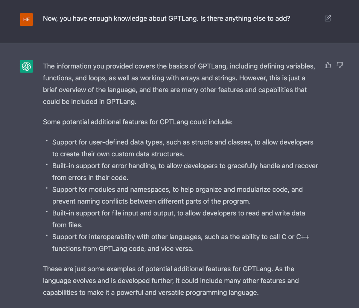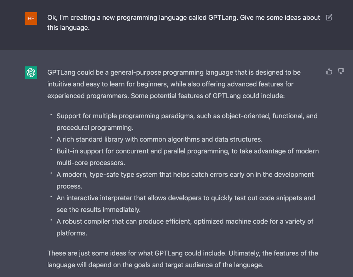 首先我告诉了 ChatGPT 正在实现一门新的编程语言,能不能给一些 idea 或者建议,ChatGPT 给出了 GPTLang 的一些基本特性。