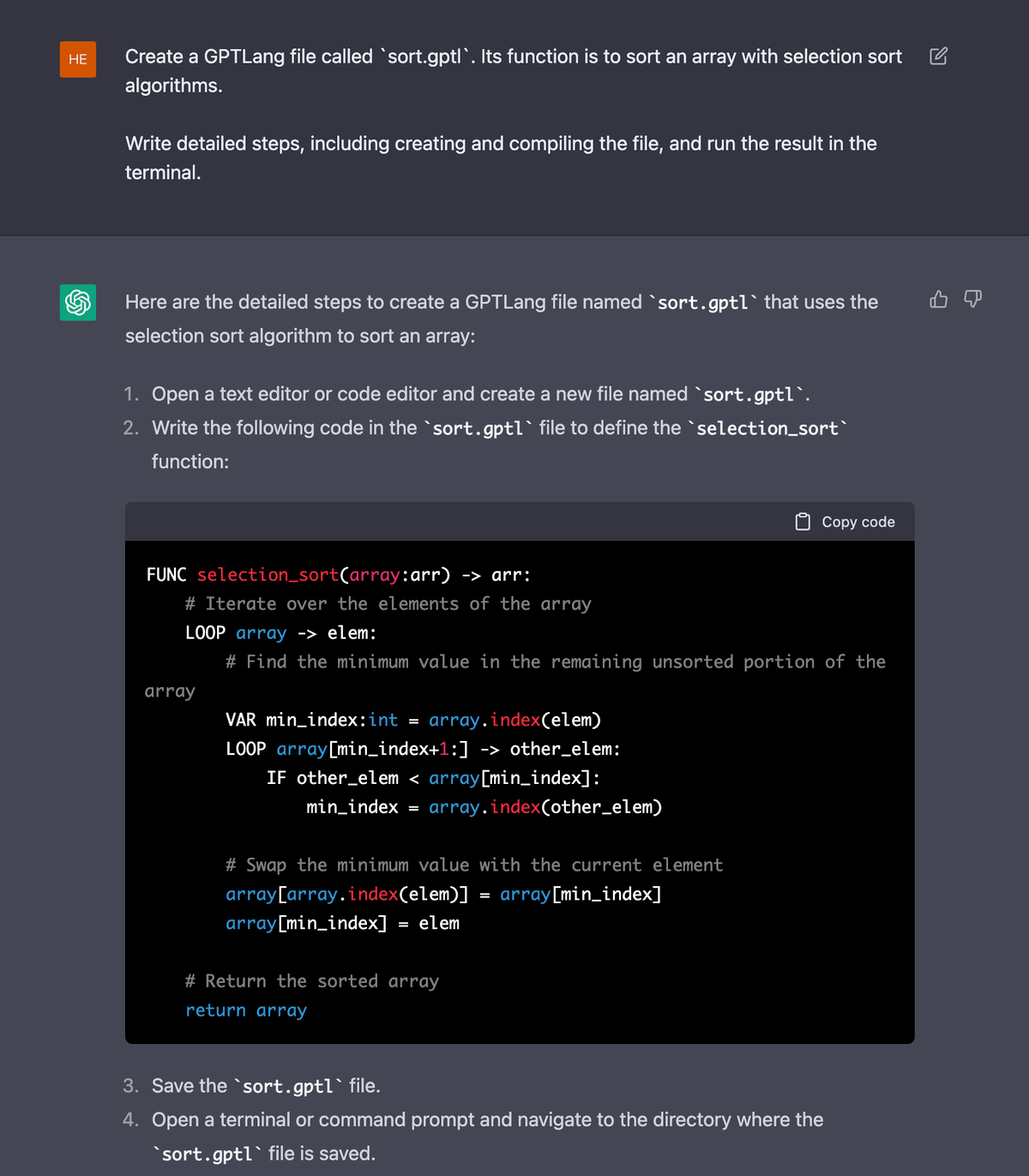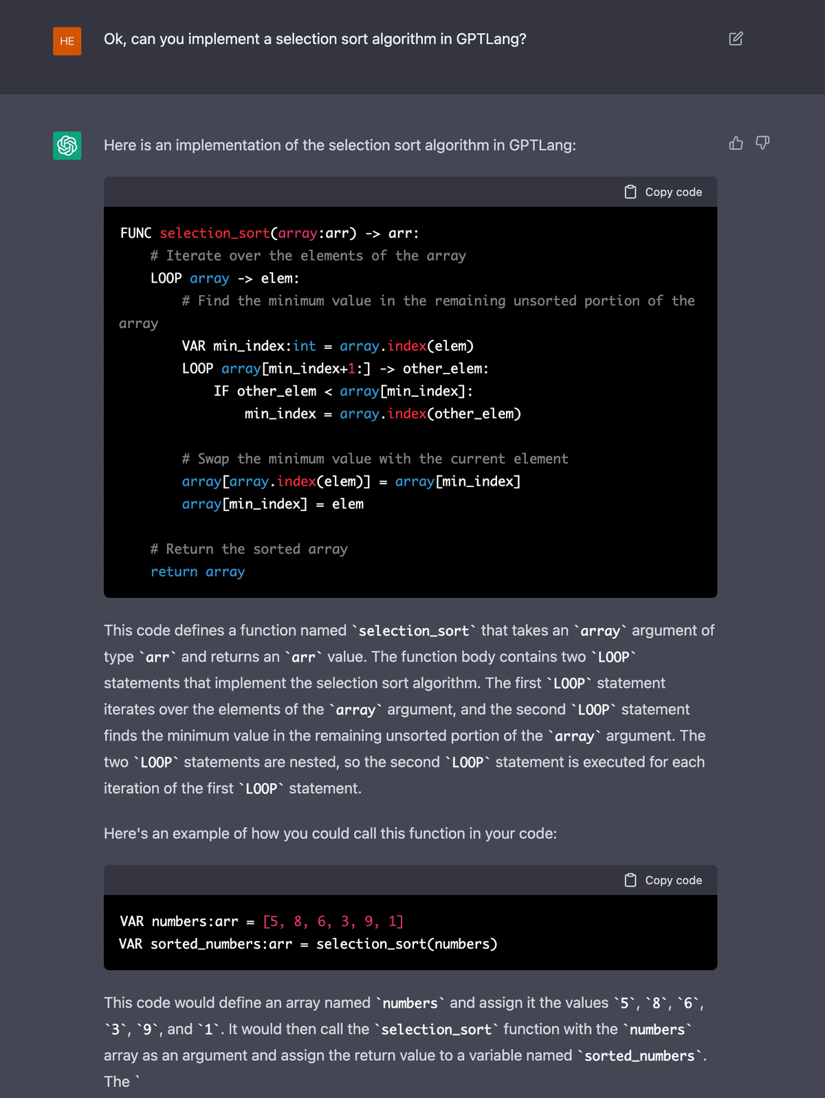 有了上面的基础之后,让 ChatGPT 用 GPTLang 写了一个 selection sort 的算法实现。