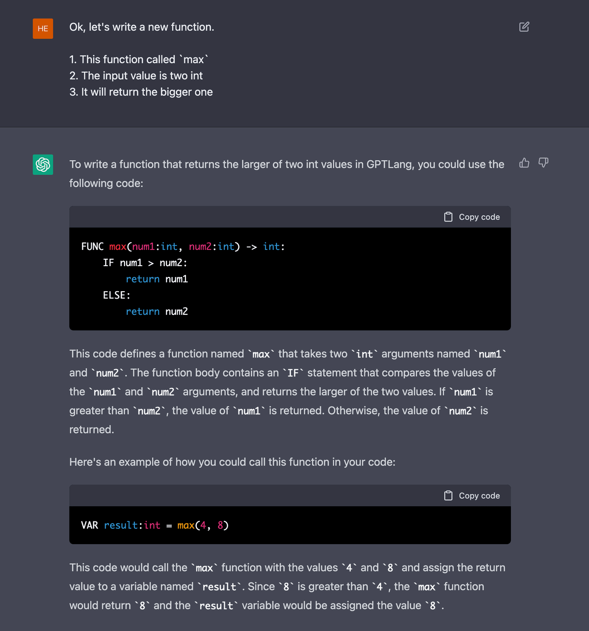 OK,有了函数和分支条件之后,ChatGPT 能否组合这两个语法来实现一个函数? 获取两个数中更大的那一个,并返回。 很显然,ChatGPT 很好地用 GPTLang 的语法实现了,并且还给出了指示。