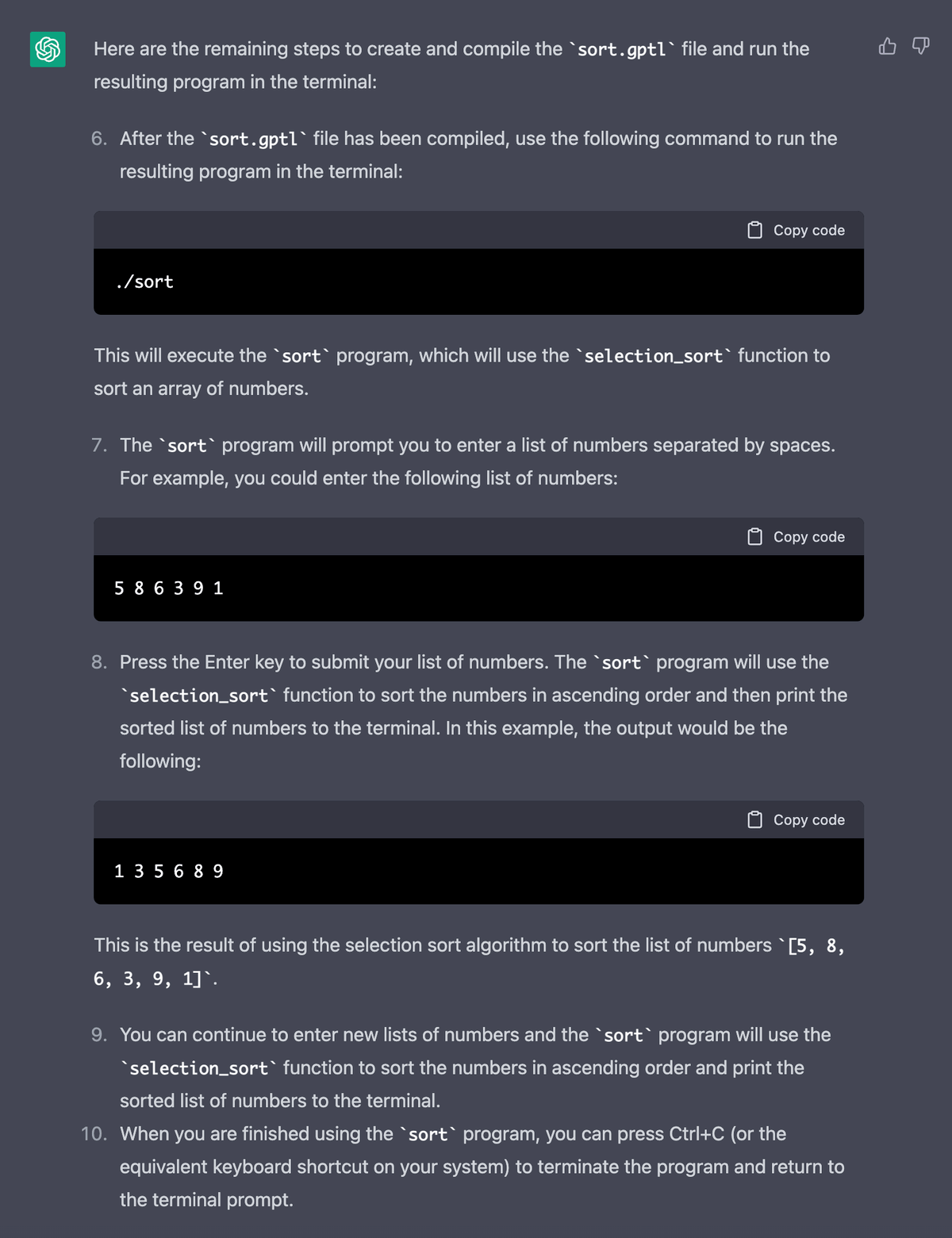在 ChatGPT 中实现了一门新的编程语言:GPTLang,并用这个语言写了一个排序算法。 定义了一个新的命令 `gptlc`,用来编译 GPTLang 的代码。 下图是最终的效果:让 ChatGPT 用 GPTLang 写了一个选择排序,并在命令行编译运行。 这个 thread 将会详细讲述一下是如何一步步实现这门语言的。