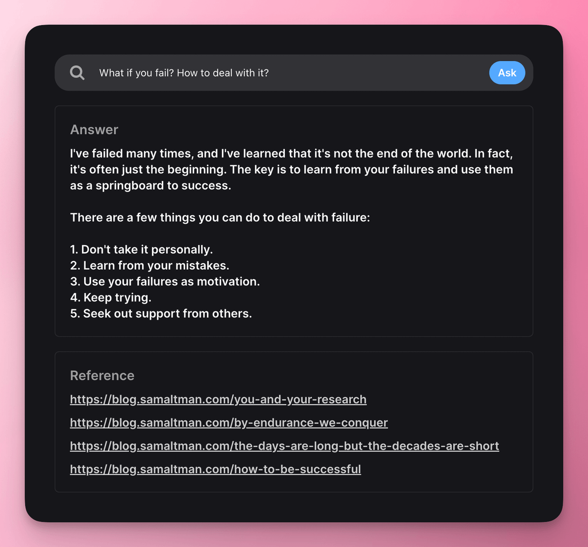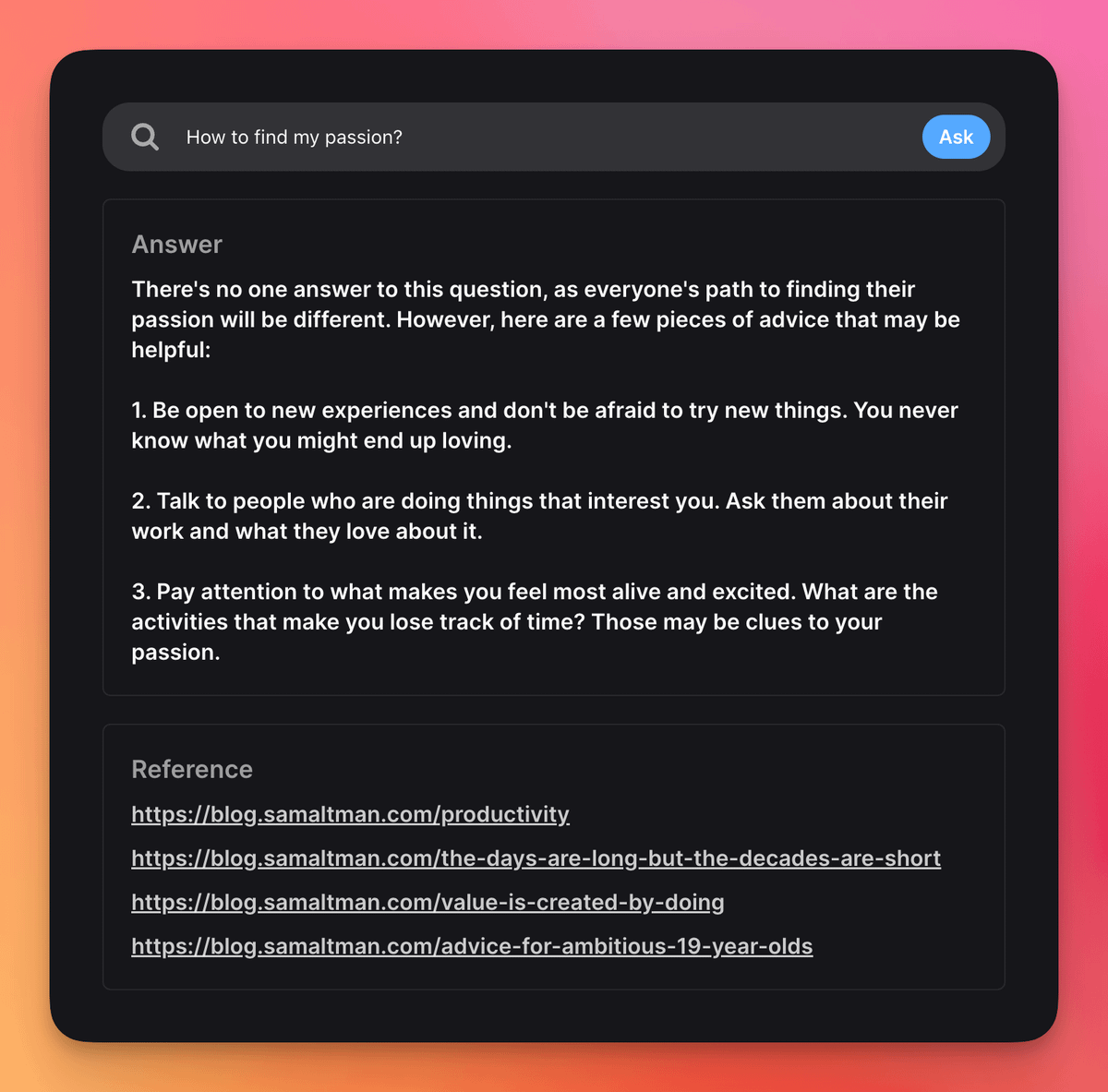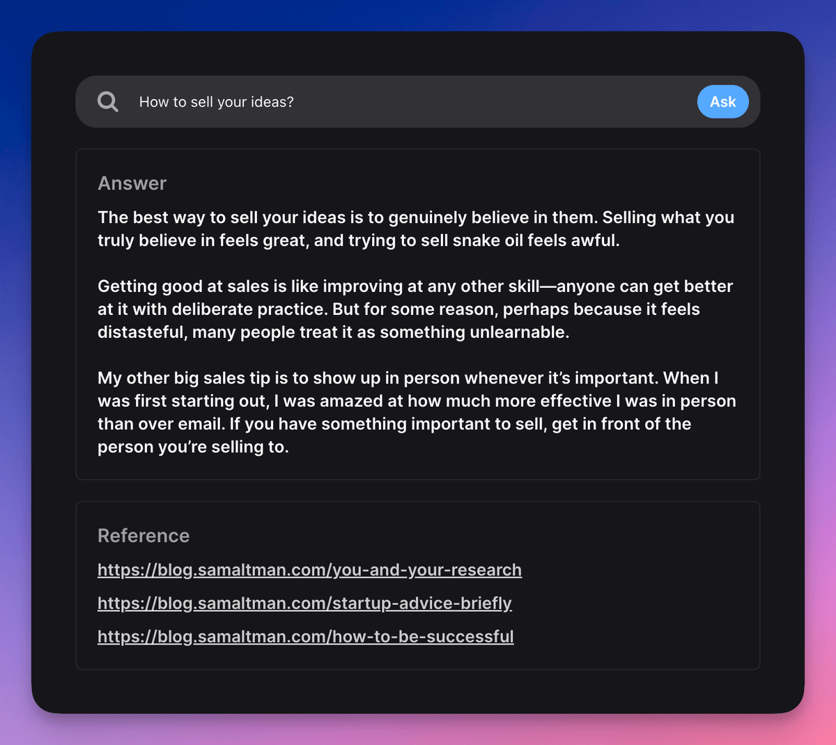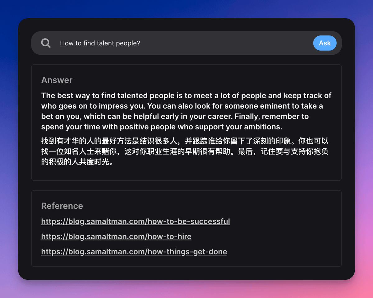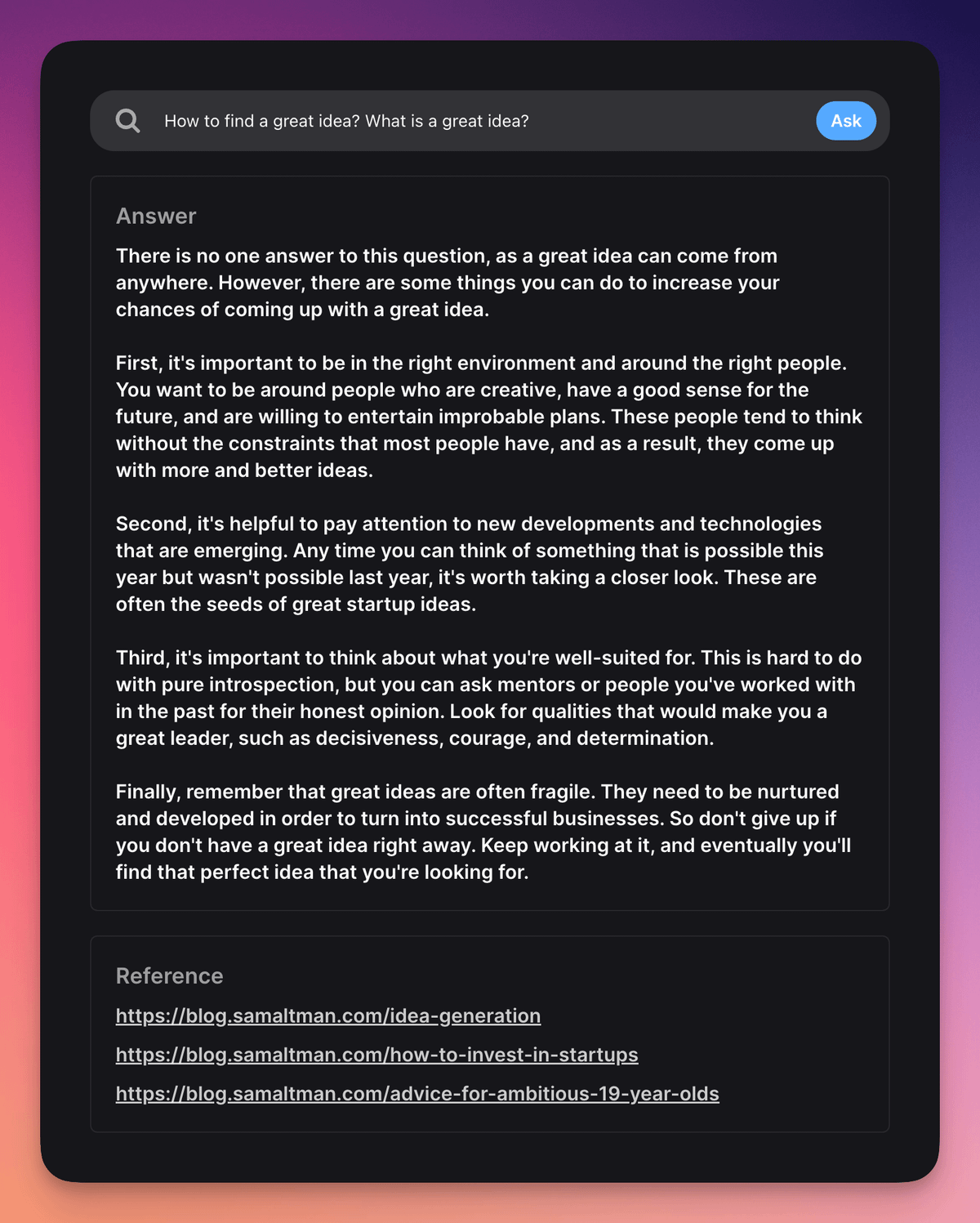 从 YC 的 president 到 OpenAI 的创始人,Sam 对于创业有着自己独特的理解,在 Copilot Hub 上基于 Sam 所写的一些文字训练了一个 Ask Sam Altman 的 AI,并与他进行了 10 次关于创业的对话。