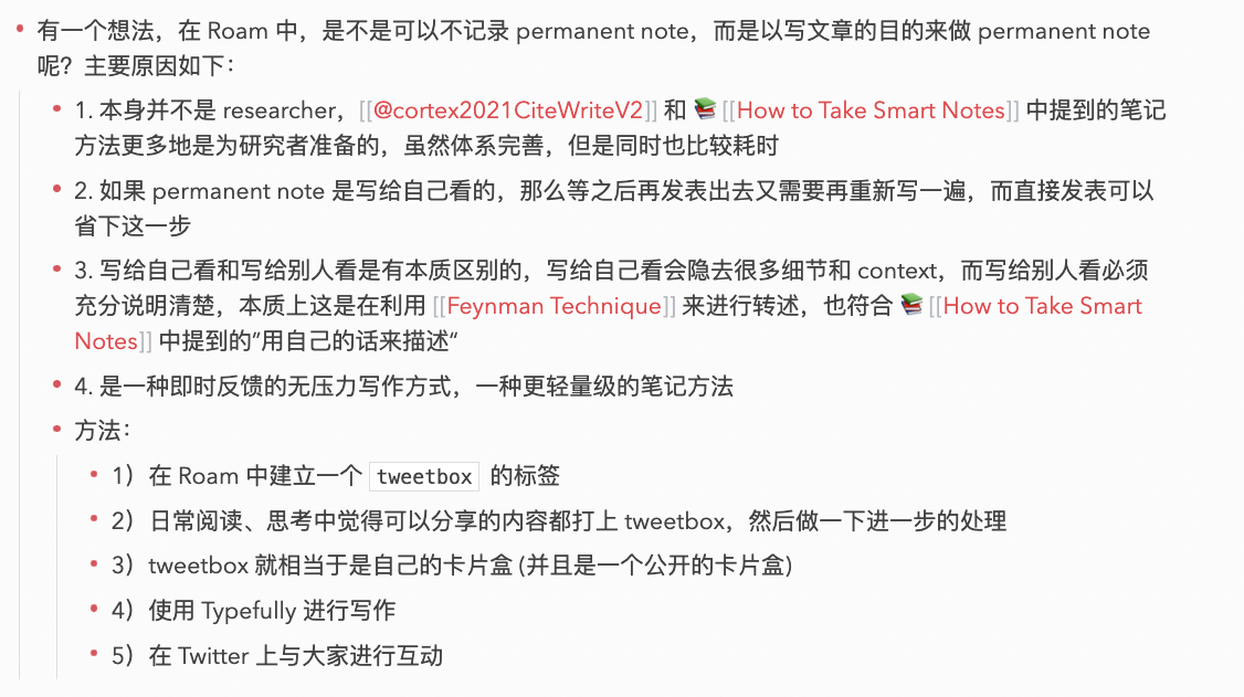 1. permanent note 的写作是比较耗时的,How to Take Smart Notes 这本书更多地是面向研究者的写作和笔记方式,虽然体系完善,但是相对比较耗时,对于普通用户来说有一些 overwhelming