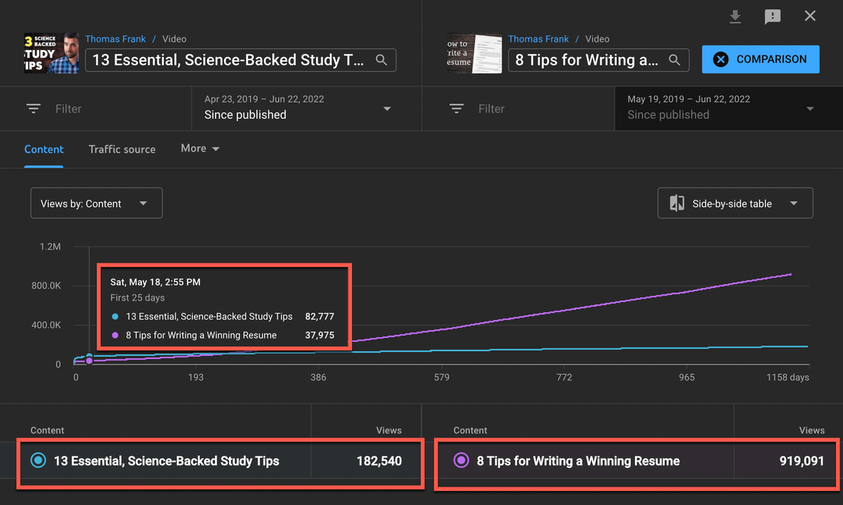 Why exactly did that 38K-view résumé video get so many more sponsor clicks than the 83K-view study tips video?